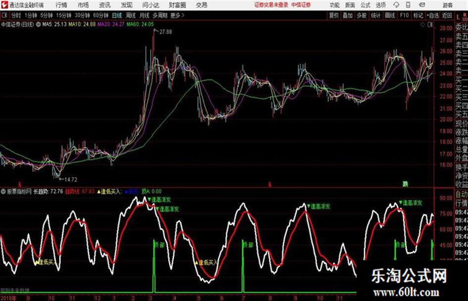 q2:=(CLOSE-LLV(LOW, 18))/(HHV(HIGH, 18)-LLV(LOW, 18))*100;q3:=SMA(q2, 9, 1);q4:=SMA(q3, 3, 1);长趋势:3*q3-2*q4,colorwhite,linethick3;趋势线:EMA(q3, 3),colorred,linethick3;DRAWTEXT(CROSS(趋势线, 长趋势) AND REF(长趋势,1)>80, REF(长趋势,3), '▼逢高派发'), Color00ff00,linethick5;▲逢低买入: DRAWTEXT(REF(CROSS(趋势线,长趋势),82) AND 趋势线>1.3*长趋势,长趋势,'▲逢低买入'), Color00Ffff, linethick1;▲低买: DRAWTEXT(REF(CROSS(长趋势,趋势线),1) AND 长趋势>1.3*趋势线,趋势线,'▲低买'),colorblue,linethick1;var3:=PEAKBARS(3,15,1)<10;var5:=IF(var3=1,2,0);顶:= IF(var5=2,2,0);顶a:IF(顶>REF(顶,1),50,0),colorgreen, linethick2;DRAWTEXT(顶a=50,45,'顶 部'),color00ff00;