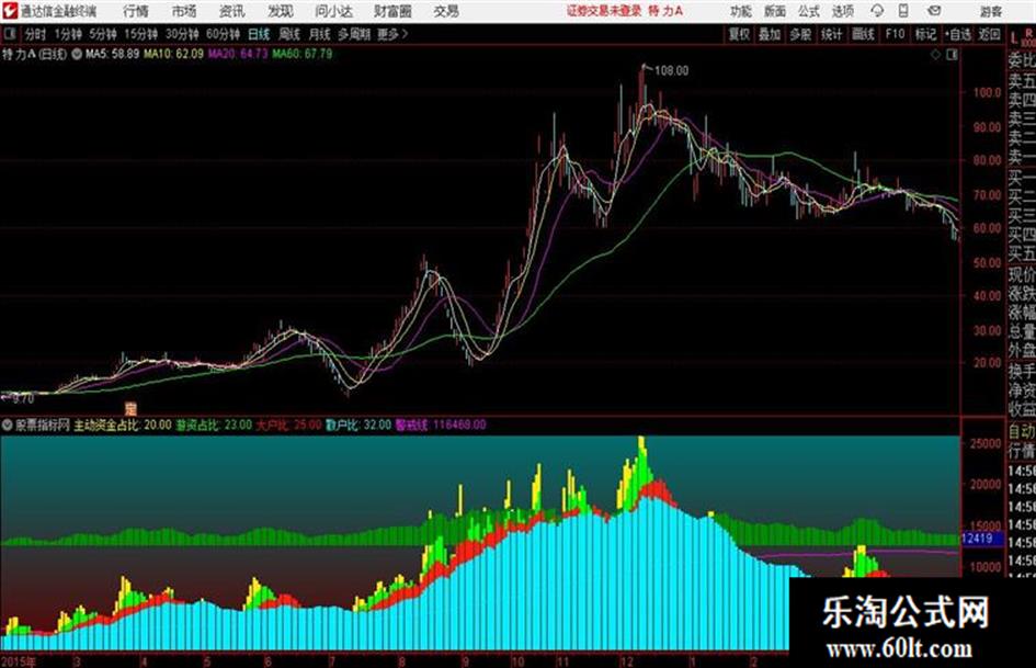 DRAWGBK(CLOSE>0,RGB(0,108,108),RGB(88,0,0),0,5,0);CCCC:=1; A:=IF((CLOSE > 126.32),(AMOUNT / 100000),VOL);主力:=MA(A,4),NODRAW,COLOR00FFFF;游资:=MA(A,8),NODRAW,COLOR00FF00;大户:=MA(A,16),NODRAW,COLOR0000FF;散户:=MA(A,32),NODRAW,COLORFFFF00;主动资金占比:ROUND(((主力 / (((主力 + 游资) + 大户) + 散户)) * 100)),NODRAW,COLOR00FFFF;游资占比:ROUND(((游资 / (((主力 + 游资) + 大户) + 散户)) * 100)),NODRAW,COLOR00FF00;大户比:ROUND(((大户 / (((主力 + 游资) + 大户) + 散户)) * 100)),NODRAW,COLOR0000FF;散户比:ROUND(((散户 / (((主力 + 游资) + 大户) + 散户)) * 100)),NODRAW,COLORFFFF00;警戒线:MA(A,180),COLORFF00FF;STICKLINE((主力 > 0),0,主力,3,0),COLOR0000FF;STICKLINE((主力 > 0),0,主力,2.7.5,0),COLOR001BFF;STICKLINE((主力 > 0),0,主力,2.4,0),COLOR0035FF;STICKLINE((主力 > 0),0,主力,2.1,0),COLOR0050FF;STICKLINE((主力 > 0),0,主力,1.8,0),COLOR0062FF;STICKLINE((主力 > 0),0,主力,1.5,0),COLOR007AFF;STICKLINE((主力 > 0),0,主力,1.2,0),COLOR0089FF;STICKLINE((主力 > 0),0,主力,0.9,0),COLOR009CFF;STICKLINE((主力 > 0),0,主力,0.6,0),COLOR00C0FF;STICKLINE((主力 > 0),0,主力,0.3,0),COLOR00EAFF;STICKLINE((游资 > 0),0,游资,3,0),COLOR007F00;STICKLINE((游资 > 0),0,游资,2.7,3),COLOR008B00;STICKLINE((游资 > 0),0,游资,2.4,0),COLOR009500;STICKLINE((游资 > 0),0,游资,2.1,0),COLOR00A300;STICKLINE((游资 > 0),0,游资,1.8,0),COLOR00AF00;STICKLINE((游资 > 0),0,游资,1.5,0),COLOR00C000;STICKLINE((游资 > 0),0,游资,1.2,0),COLOR00CA00;STICKLINE((游资 > 0),0,游资,0.9,0),COLOR00DB00;STICKLINE((游资 > 0),0,游资,0.6,0),COLOR00FF00;STICKLINE((大户 > 0),0,大户,3,0),COLOR102088;STICKLINE((大户 > 0),0,大户,2.7,0),COLOR102099;STICKLINE((大户 > 0),0,大户,2.4,0),COLOR1020AA;STICKLINE((大户 > 0),0,大户,2.1,0),COLOR1020BB;STICKLINE((大户 > 0),0,大户,1.8,0),COLOR1020CC;STICKLINE((大户 > 0),0,大户,1.5,0),COLOR1020DD;STICKLINE((大户 > 0),0,大户,1.2,0),COLOR1020EE;STICKLINE((大户 > 0),0,大户,0.9,0),COLOR1020FF;STICKLINE((散户 > 0),0,散户,3,0),COLORFF7700;STICKLINE((散户 > 0),0,散户,2.7,0),COLORFF8800;STICKLINE((散户 > 0),0,散户,2.4,0),COLORFF9900;STICKLINE((散户 > 0),0,散户,2.1,0),COLORFFAA00;STICKLINE((散户 > 0),0,散户,1.8,0),COLORFFBB00;STICKLINE((散户 > 0),0,散户,1.5,0),COLORFFCC00;STICKLINE((散户 > 0),0,散户,1.2,0),COLORFFDD00;STICKLINE((散户 > 0),0,散户,0.9,0),COLORFFEE00;