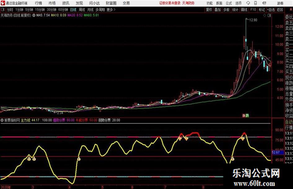 3、副图,当"黄色主力线"上穿"强势分界"显示”红箭头“信号,”强势股区域“显示"红色线条"。