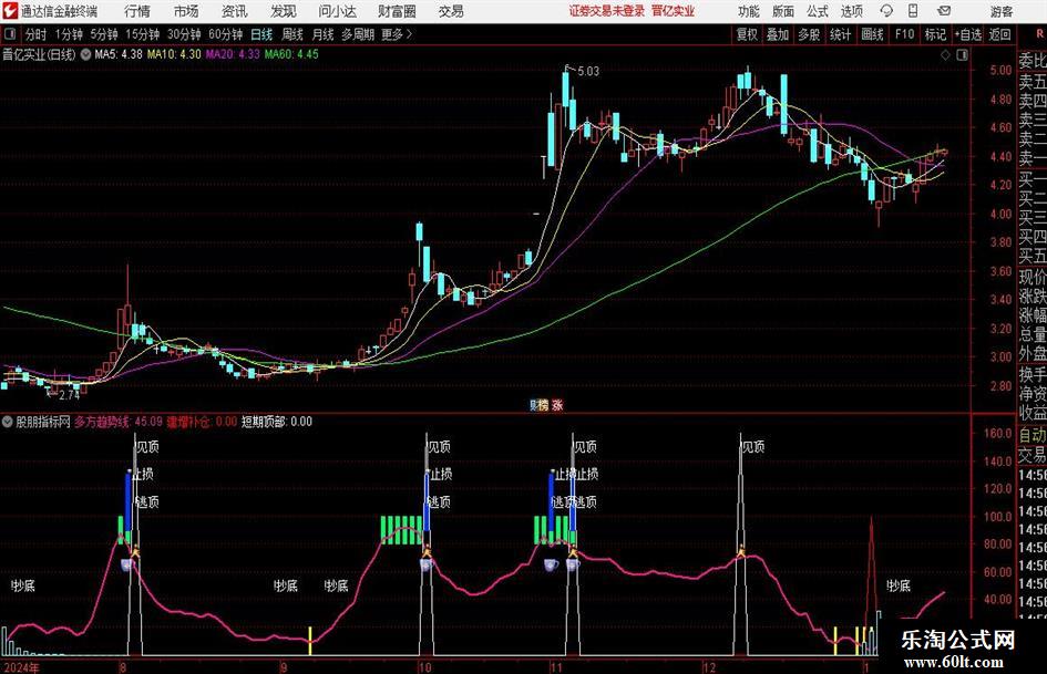 买入信号:=STICKLINE(CROSS(股价趋势,底部警戒),0,30,3,0),COLORWHITE;