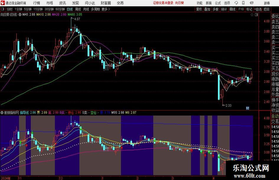 B买:IF(CROSS(指导线,界) OR CROSS(买线,卖线),C,DRAWNULL),COLORMAGENTA,NODRAW;