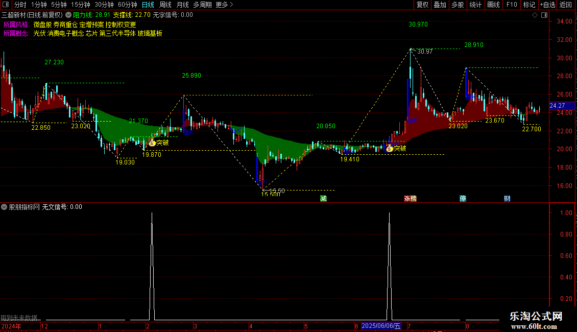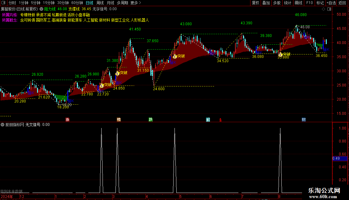 公式把MACD、高低点、缺口、量能四合一,用5、60EMA做“乾坤带”,红绿云带一眼辨趋势;再抓11日高低点,自动画黄/白点状通道,突破绿阻力线即出★“突破”信号,K线放量2倍同步蓝K提醒。手机、电脑完全通用,无未来函数。