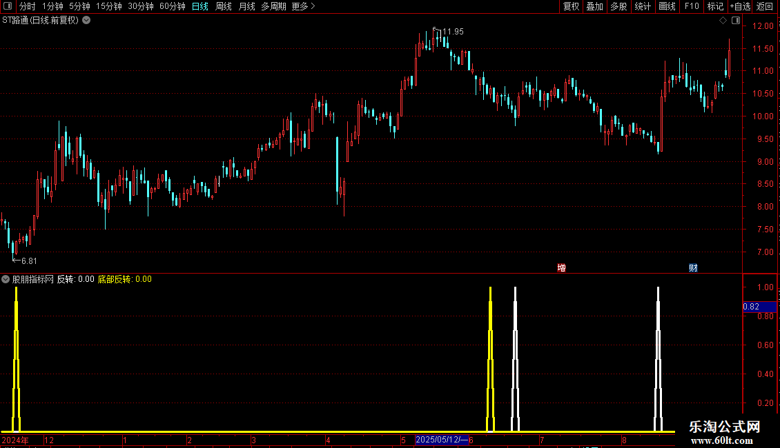 指标主要功能是识别股票价格反转信号。HG2衡量短期超卖状态,HG3评估多空力量对比,当两者同时低于阈值时触发白色反转信号。HG4-HG5通过筹码分布计算主力控盘度,HG6以灰色线条可视化。HG7-HG8用红绿双线显示短期与中期偏离度,当红线低位上穿绿线且HG2突破25时,触发黄色底部反转信号。核心策略是捕捉超跌后的主力介入机会,适合短线反弹操作。