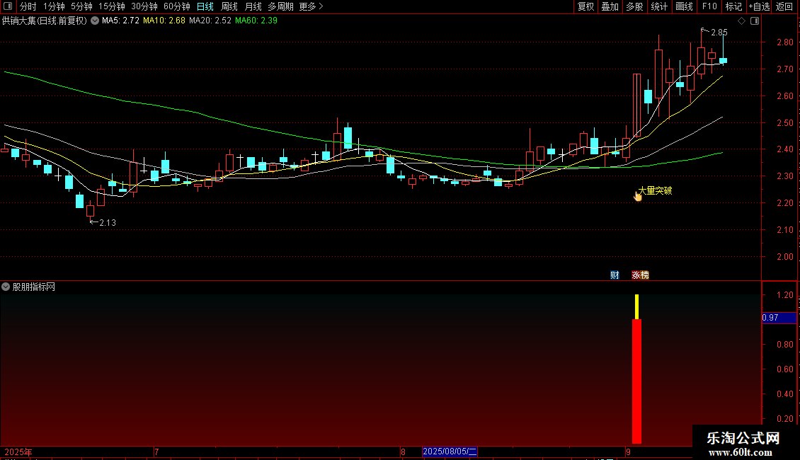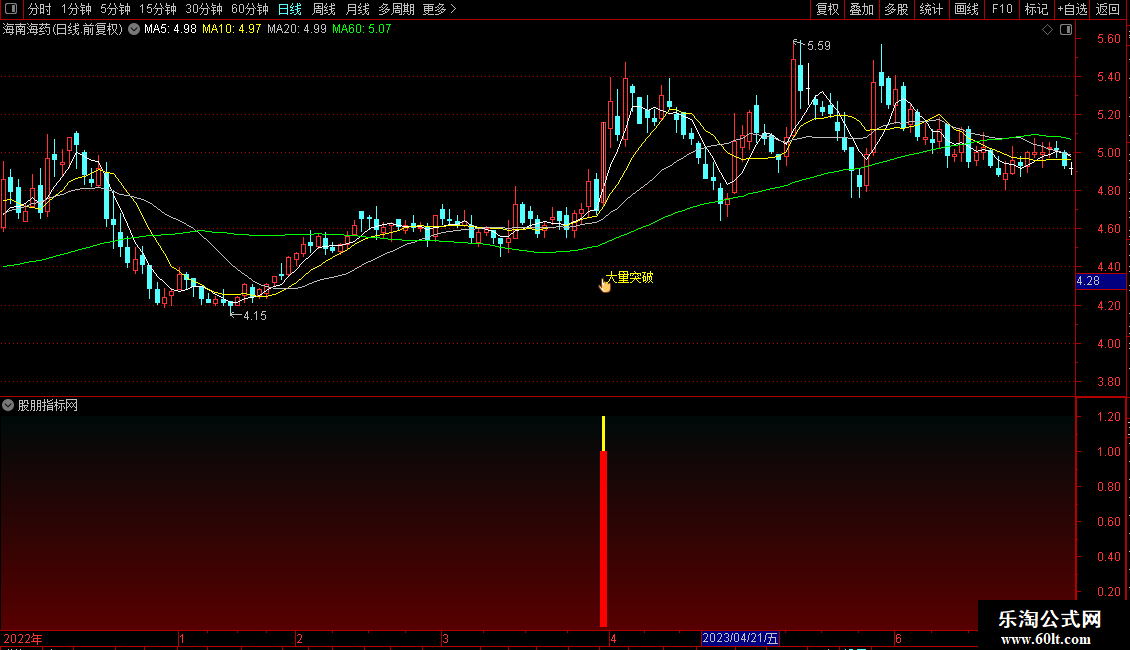 DRAWTEXT(选股信号,L*0.92,' 大量突破'),COLORYELLOW;