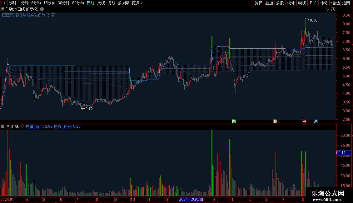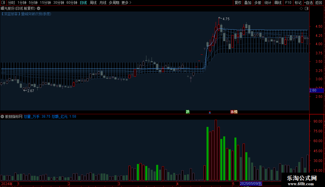 【量学均线】双形态DMA均线主图(量峰突破识别/模拟成本分布)+成交量标记副图