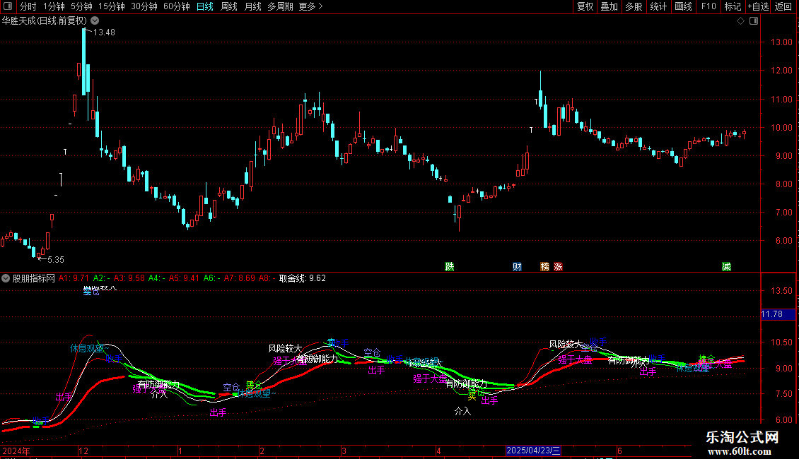 A4:IF(EMA((2*CLOSE+HIGH+LOW)/4,10)<REF(EMA((2*CLOSE+HIGH+LOW)/4,13),1),B2,DRAWNULL),LINETHICK2,COLOR00FF00;