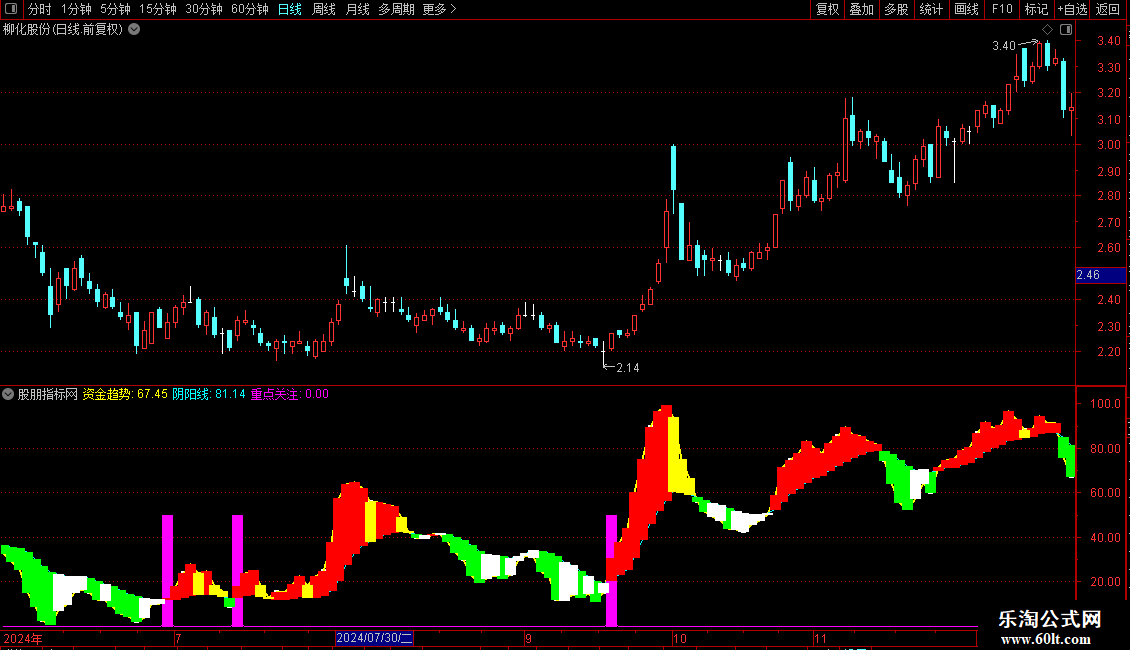 弱势反弹:STICKLINE(资金趋势<阴阳线 AND 资金趋势>(REF(资金趋势*0.95,1)),资金趋势,阴阳线,5,0),COLORWHITE;
