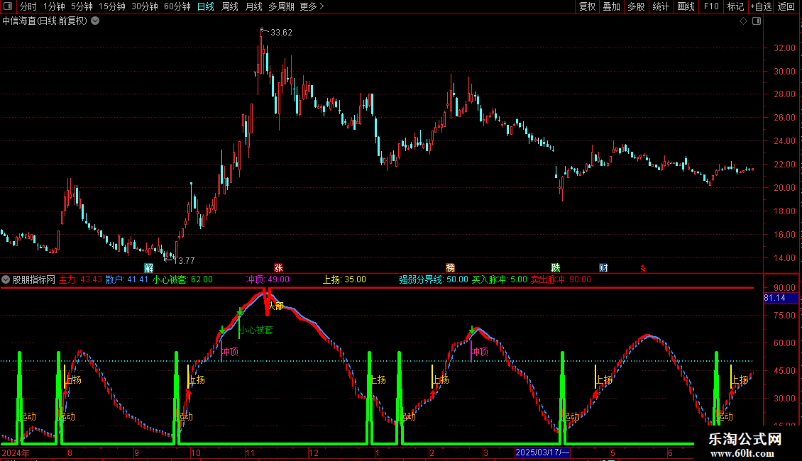 小心被套:IF(CROSS(主力,75) AND 散户<主力,75,62),STICK,LINETHICK2,COLORGREEN;62,STICK,LINETHICK2,COLOR000000;