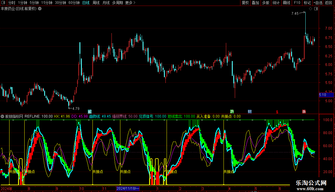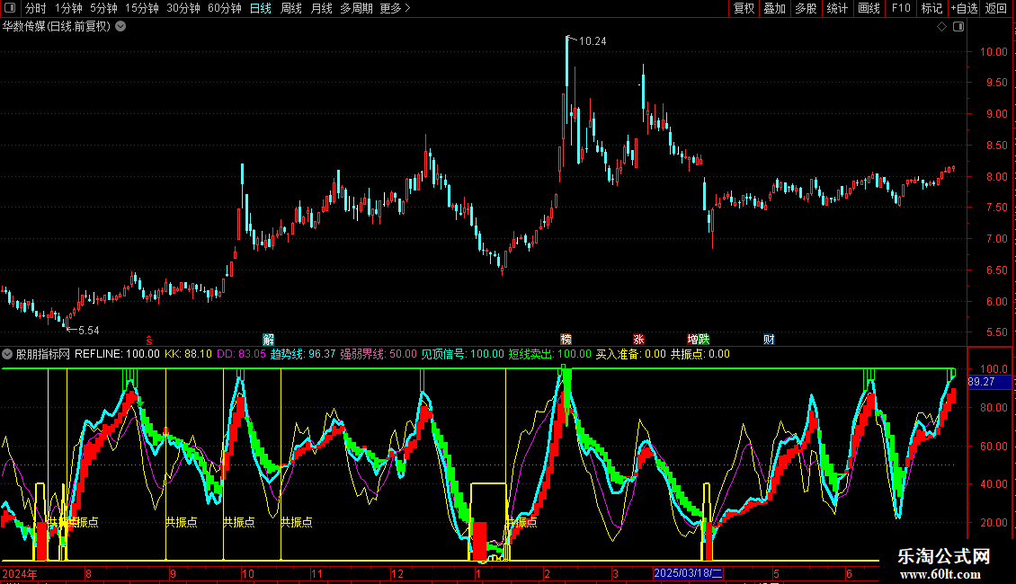 DRAWTEXT(CROSS(K,D) AND CROSS(KK,DD),20,'共振点'),COLOR00FFFF;