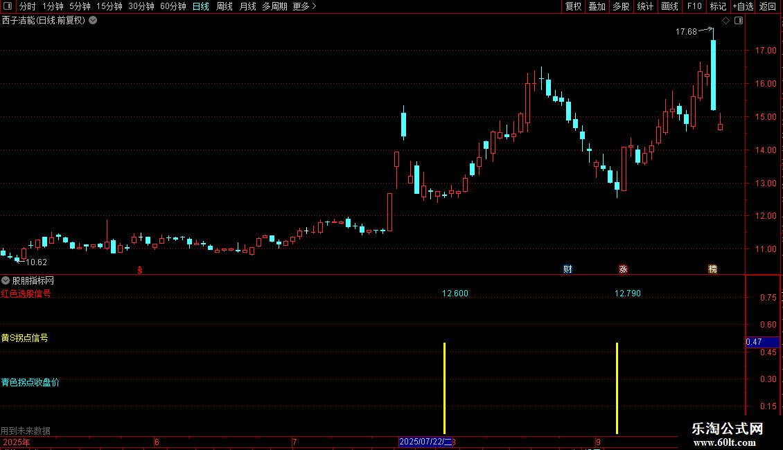 本指标专锁跌透二买暴力反转点。黄S柱为趋势拐点,青色数字记拐点收盘价,红色箭头为选股信号。触发红色时,已同时满足: