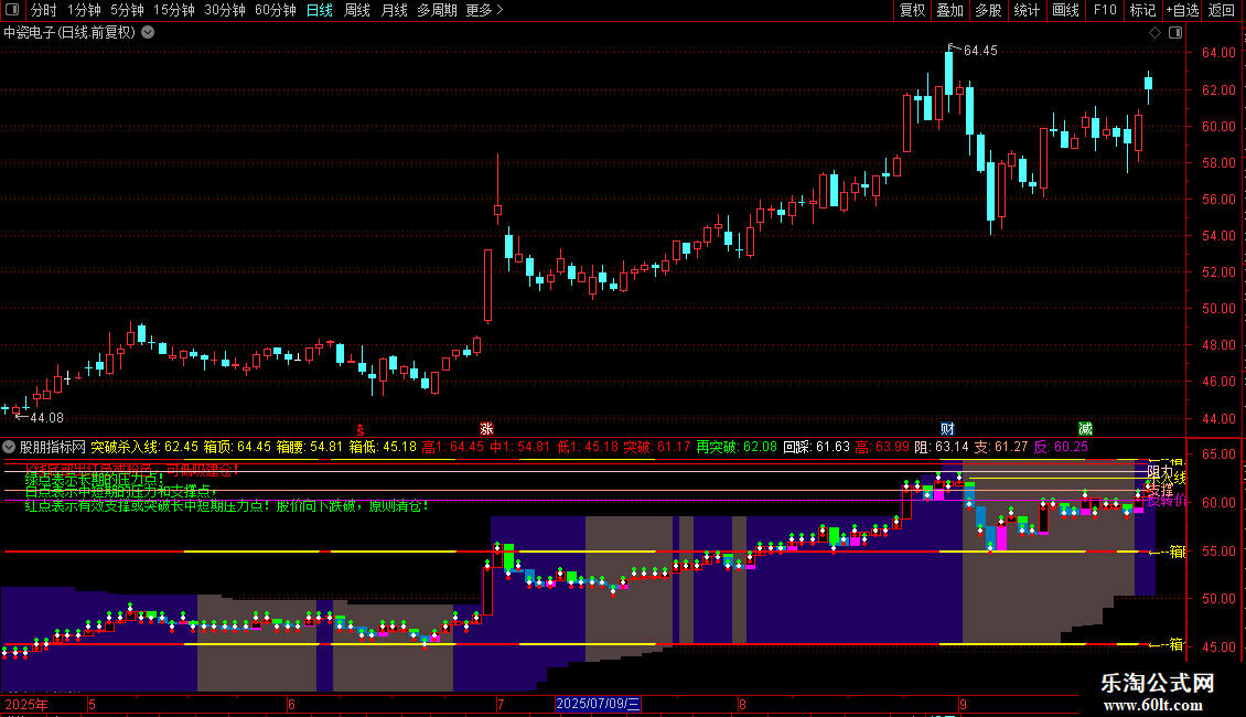 STICKLINE(买线>=卖线,HHV(H,60),LLV(L,60),5,0),