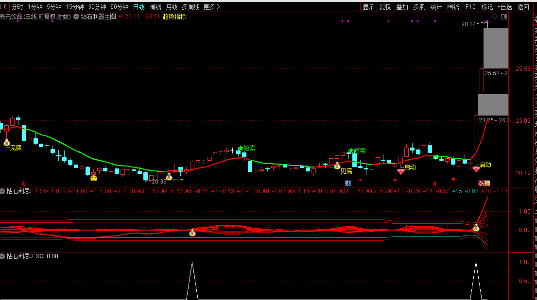 主图“钻石”图标=右侧启动信号,副图同期“钱袋子图标+趋势线明显发散”=右侧启动双保险。