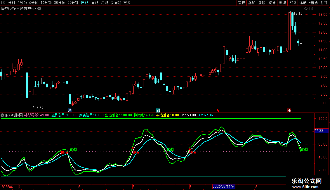 DRAWTEXT(CROSS(49,趋势线),52,'转弱'),COLORGREEN;