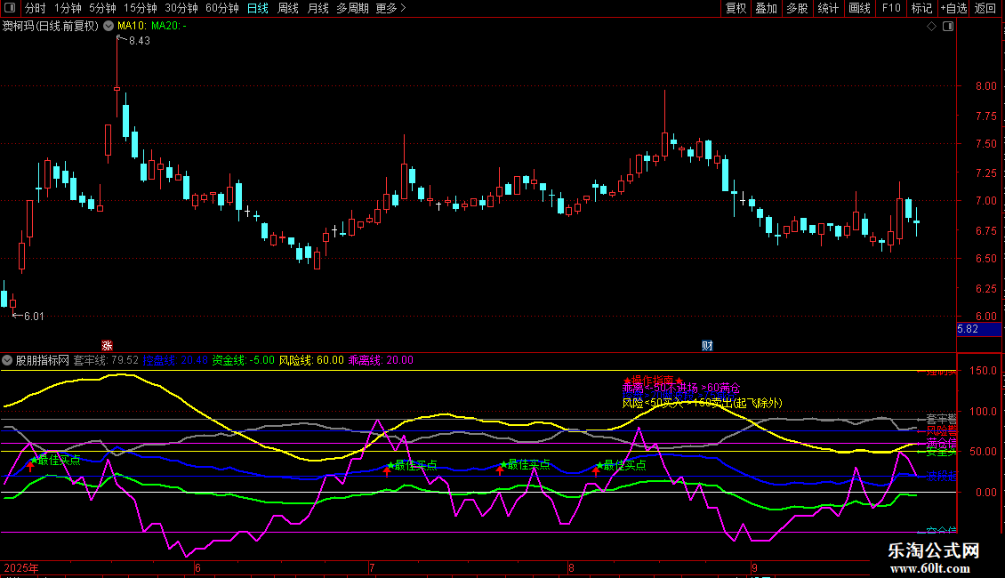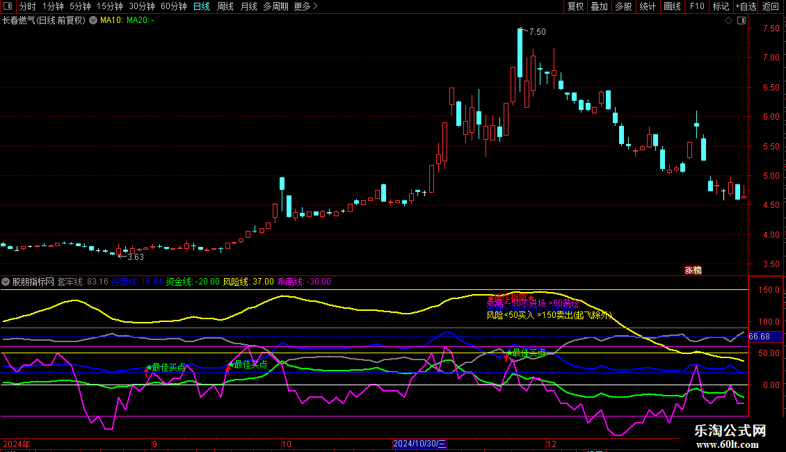 控盘线(蓝色实线):20以下为波段起点,75以上需减仓,衡量主力控盘强度;
