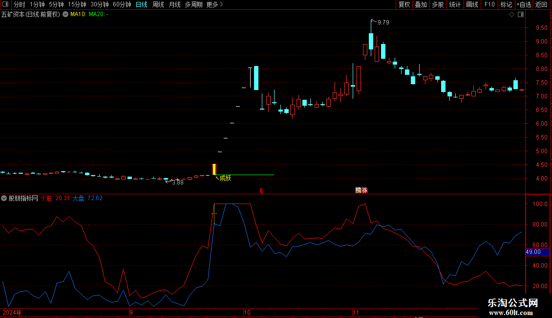 指标通过个股与大盘的相对强弱对比捕捉超买机会。个股线(蓝色)衡量股价在34日内的相对位置,大盘线(橙色)反映指数同期表现。当个股线突破90且20日内首次出现,同时满足前期涨幅温和(10日内单日涨幅<11%)、近期低位(20日内最低值<30)、持续强于大盘(20日内超10天)时,触发黄色信号柱。操作上:黄柱出现为短线买入信号,结合MACD(绿线)趋势确认更佳。