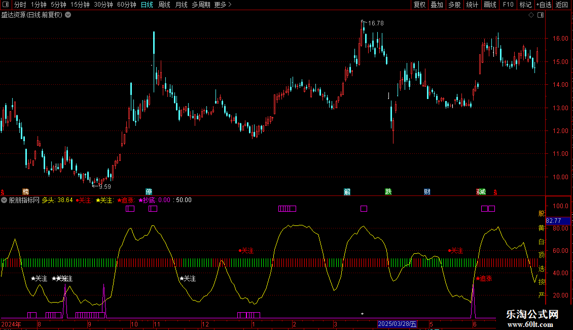 ★关注: DRAWTEXT(REF(CROSS(慢线,多头),82) AND 慢线>1.3*多头,35,'★关注'),LINETHICK1;