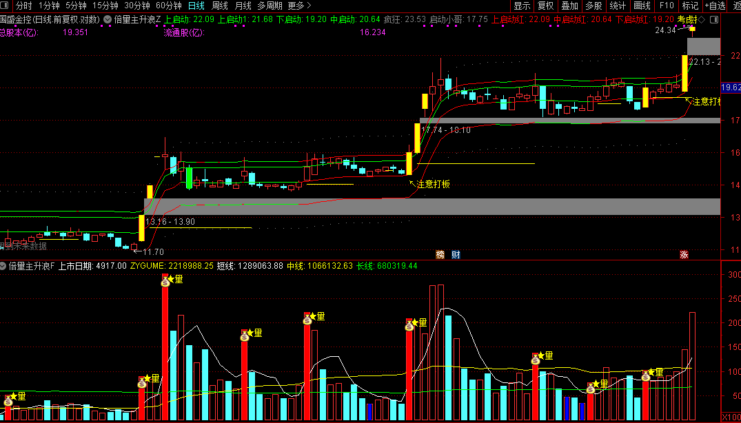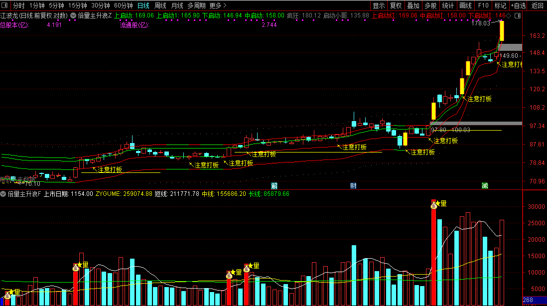 黄色涨停K线配合"注意打板"文字提示,标记强势启动信号