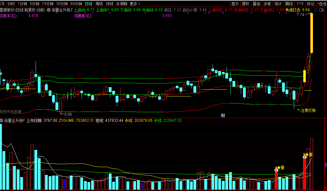 红色量柱标识倍量阳线(成交量翻倍),量能异动时显示黄色星标