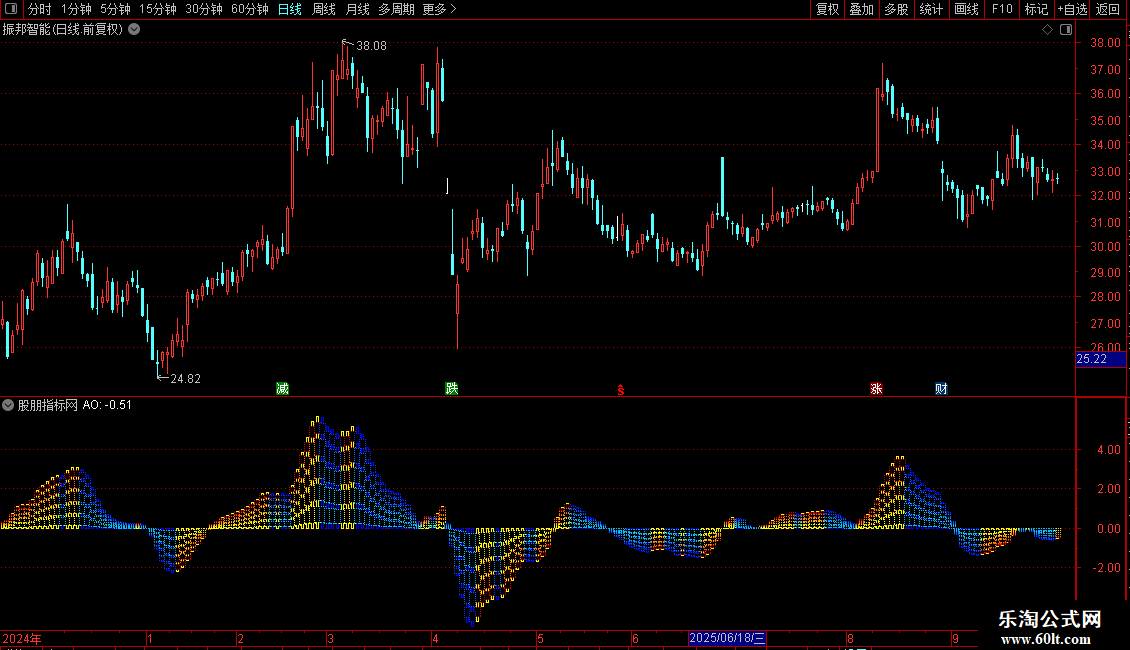STICKLINE(AO>=REF(AO,1),(AO-AO*0.6),(AO-AO*0.75),5,-1) COLOR00CCFF;