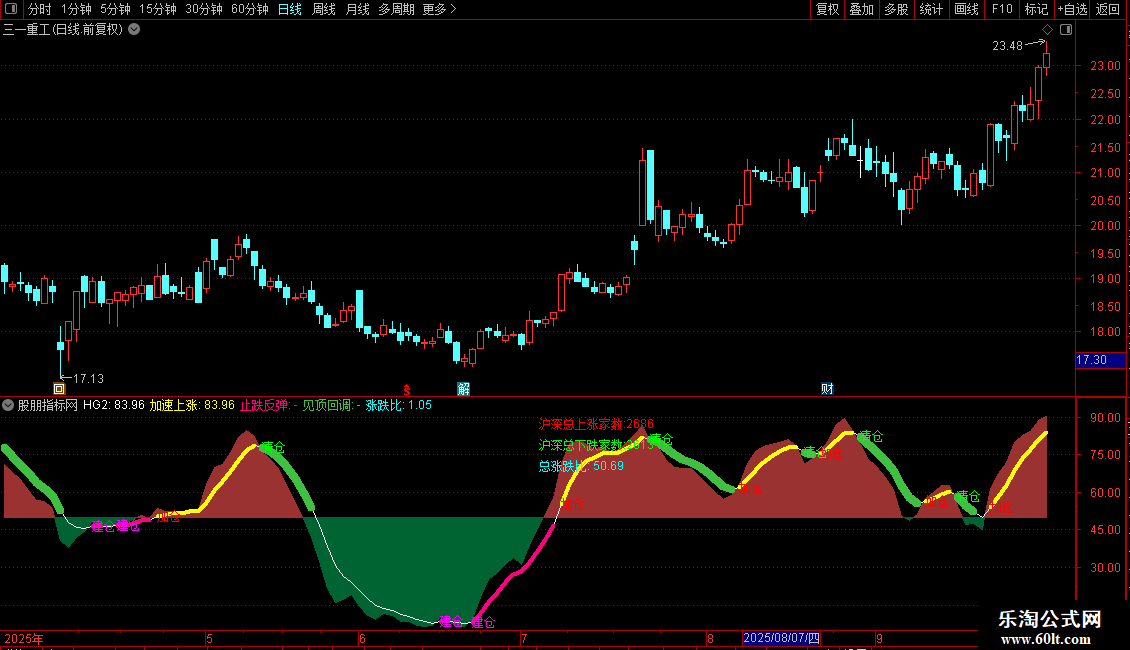 上涨趋势:=IF(HG1>50,HG1,DRAWNULL),COLORRED;