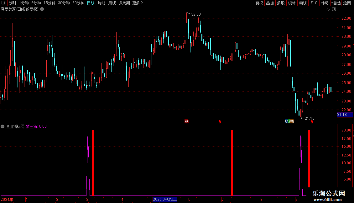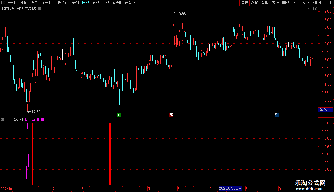 紫三角:IF((COUNT((DD>REF(DD,1)),1)=1) AND (REF(DD,1)<REF(REF(DD,1),1)) AND (DD<跟踪),20,0),COLORF00FF0;