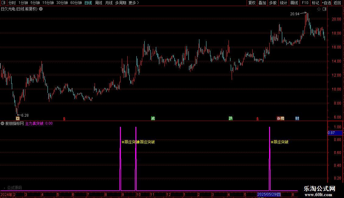 盯紧青色“跟庄突破”四字:一旦闪现,即代表股价同时踩中四大关口——放量突破主力成本、距前高仅差1.1倍且收在日内最高,叠加量能与趋势强度双重校验,确认主力真金白银进场,绝非虚涨诱多。