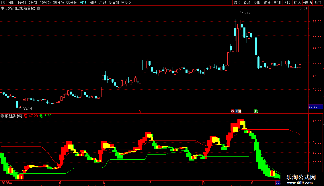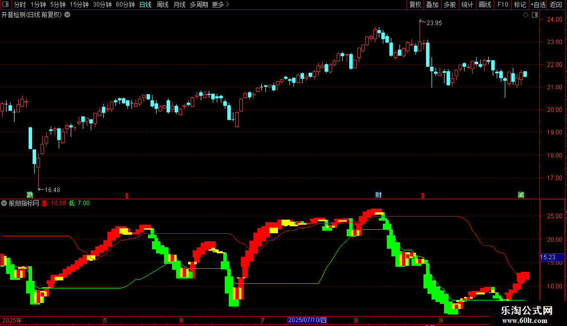 介必升:=(CLOSE-LLV(LOW,21))/(HHV(HIGH,21)-LLV(LOW,21))*1.2*CLOSE;老介1:=EMA(介必升,4);老介2:=EMA(介必升,6);老介3:=EMA(介必升,8);STICKLINE(老介1>=老介2,老介3,老介1,8,0),colorred;STICKLINE(老介1>=老介2,老介3,REF(老介1,1),5,0),colorred;STICKLINE(老介1<老介2,老介3,老介1,8,0),colorgreen;STICKLINE(老介1<老介2,老介3,REF(老介1,1),3,0),colorgreen;T1:=老介2>=老介3 AND 老介1<REF(老介1,1);T2:=老介2<老介3 AND 老介1>REF(老介1,1);STICKLINE(T1,老介1,老介3,8,0),COLOR00FFFF;STICKLINE(T1,老介1,REF(老介3,1),3,0),COLOR00FFFF;STICKLINE(T2,老介1,老介3,8,0),coloryellow;STICKLINE(T2,老介1,REF(老介3,1),3,0),colorred;高:HHV(EMA(介必升,13),21),colorred,Linethick1;低:LLV(EMA(介必升,10),21),colorgreen,Linethick1;