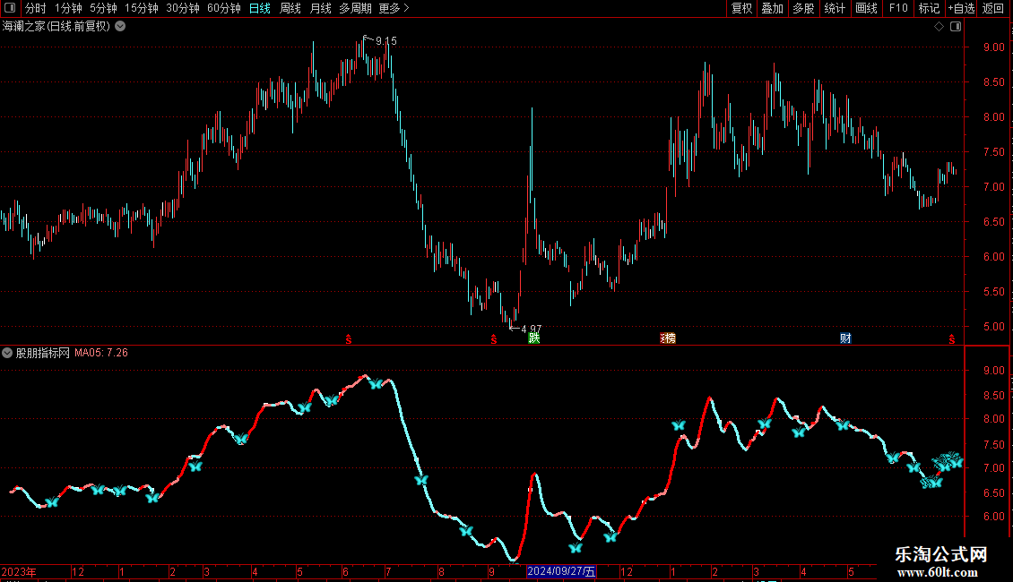 IF(X_5<0 AND MA05<REF(MA05,1),MA05,DRAWNULL),COLORFFFF80,LINETHICK3;
