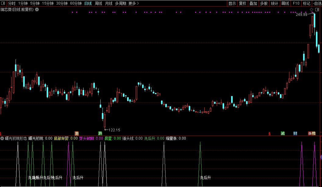 1.形态识别:自动捕捉“曙光初现”、“早晨之星”、“锤头线”等十余种经典反转K线组合,在符合条件时显示图标提示。