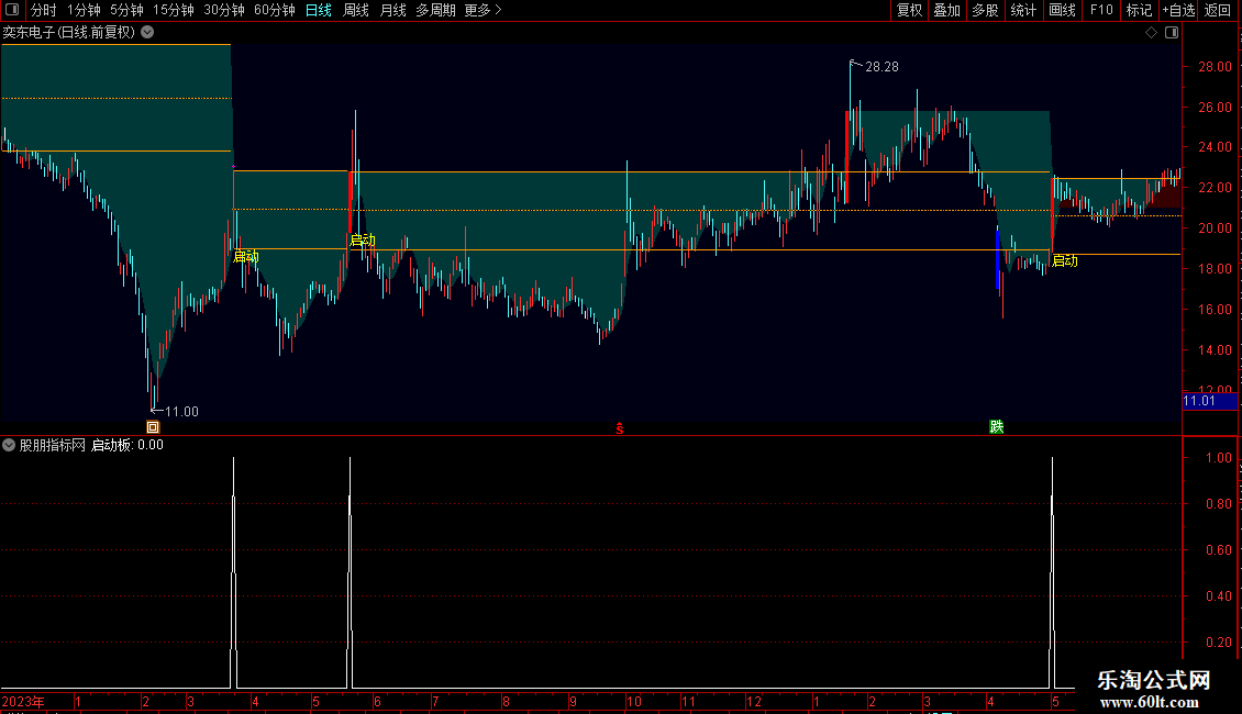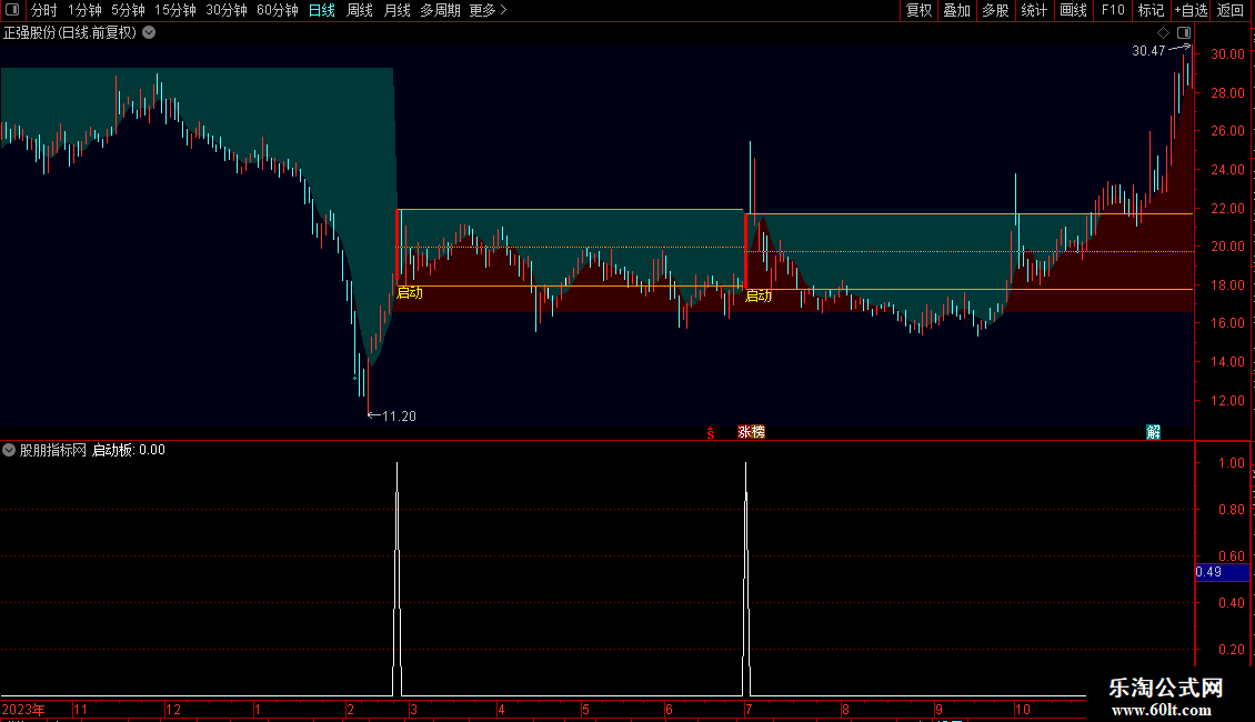 启动板:FILTER(MAXBYH<REF(MAXBYH,1) AND C>REF(L,1),5);