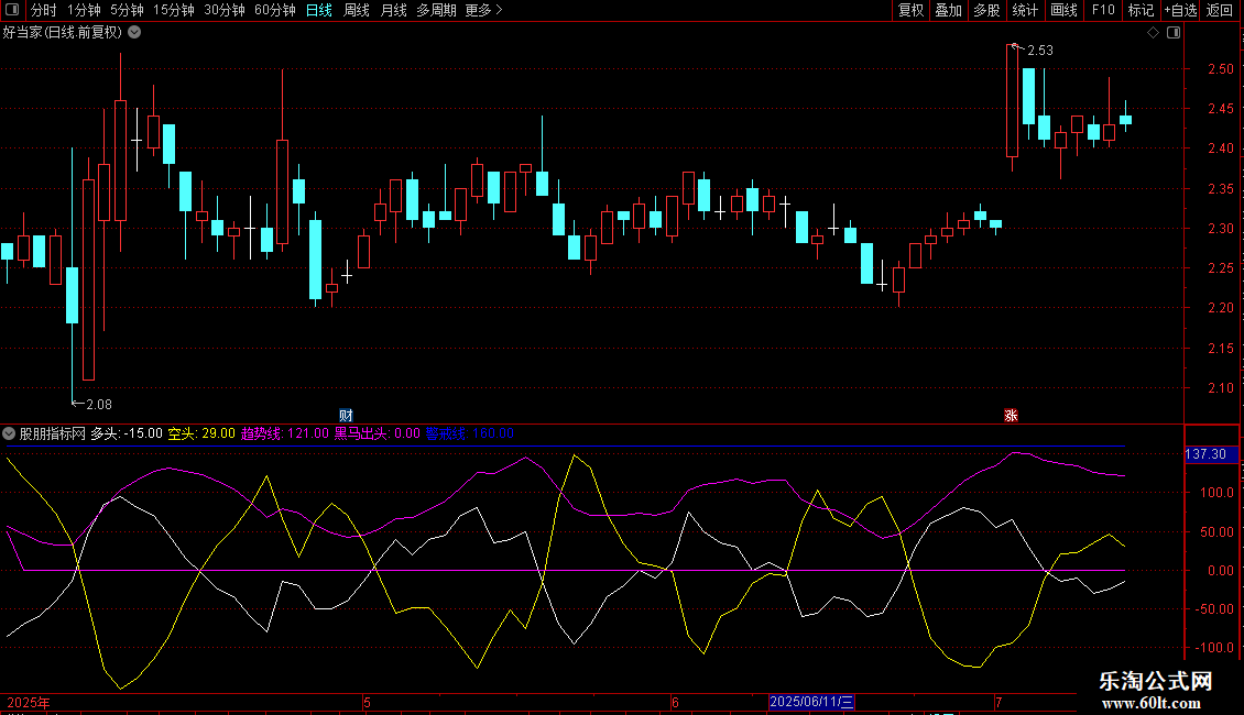 黑马出头:IF(((((CLOSE - MA(CLOSE,8)) / MA(CLOSE,8)) * 100) < (0 - 6.1)),50,0),COLORFF00FF;