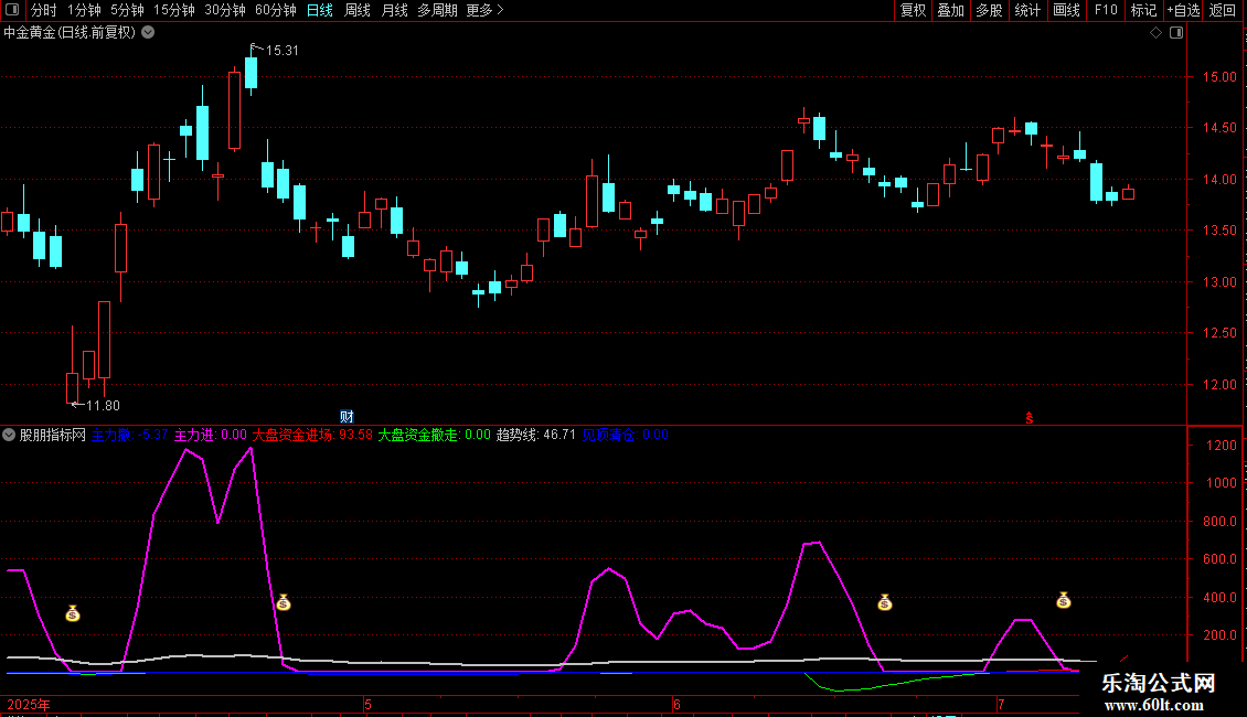 主力进: IF(V4>=0,V4,0)*100,COLORFF00FF,LINETHICK2;