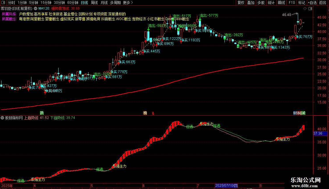 DRAWTEXT(净流入>=300 AND 涨跌幅>=4,L*0.995,VARCAT(VARCAT('净买:',VAR2STR(净流入,0)),'万')),COLORCYAN;