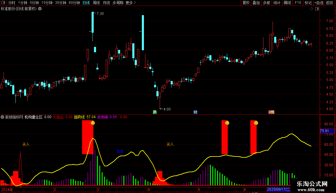 火焰山:EMA(IF(LOW<=VAR7 AND 趋势<40,(VAR11+VAR12),0),3)/618,COLORRED,LINETHICK2;