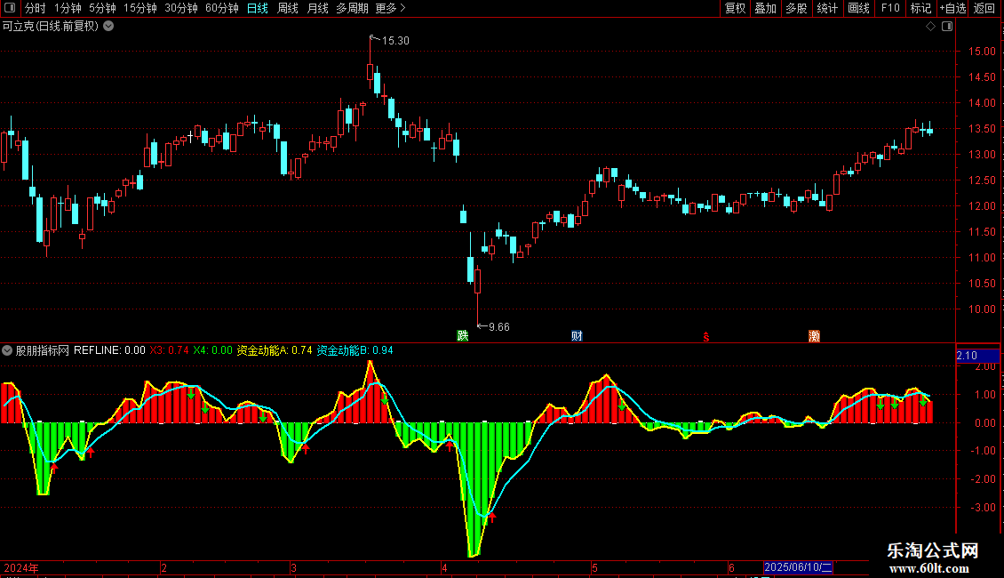 DRAWICON((CROSS(资金动能B,资金动能A) AND 资金动能A>0.25),资金动能A,2);