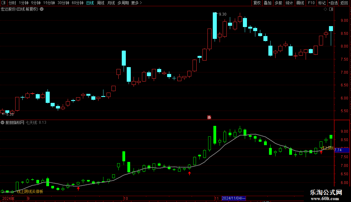 DRAWTEXT(CROSS(A4,A3),L,'线上阴线买停板'),LINETHICK4,COLOR22ACDE;