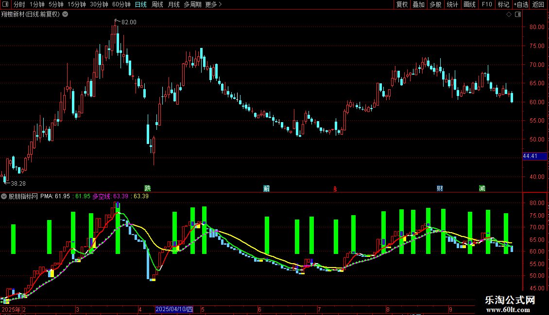 IF(A,多空线,DRAWNULL),COLOR33FF33,POINTDOT,LINETHICK4;