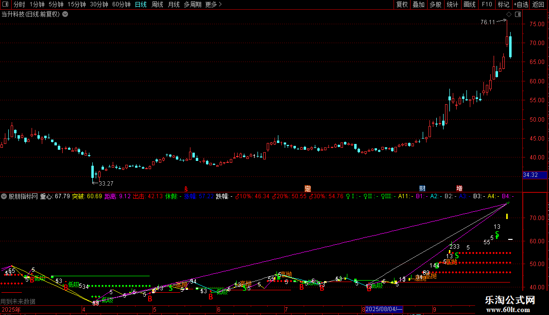 输出B4:当满足条件最低价<=55日内最低价的最低值时,在最低价位置画直线起点,当满足条件最高价>=55日内最高价的最高值时,在最高价位置画直线终点,0表示是否延长.