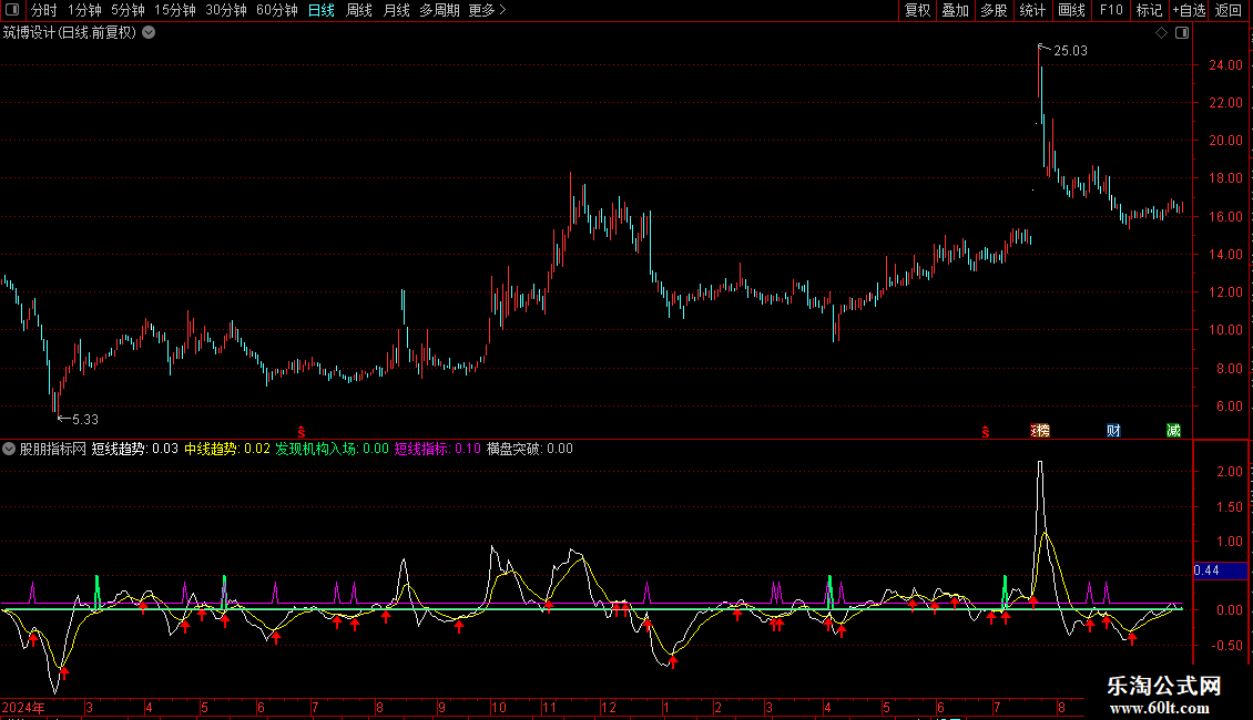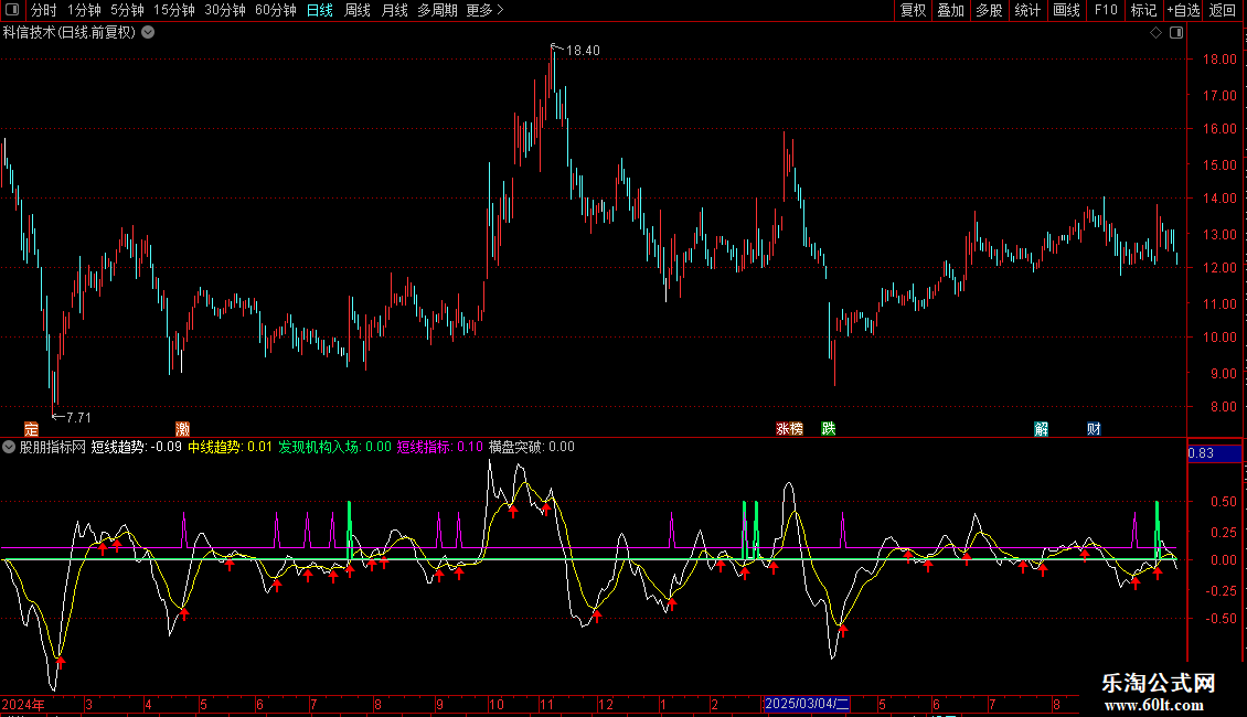 短线指标:IF(((((CROSS(短线趋势,中线趋势) AND (短线趋势 < 0)) AND (中线趋势 < (0 - 0.2)+4)) AND (VAR11 > 45)) AND (VAR16 > 0)),0.4,0.1),COLORMAGENTA;