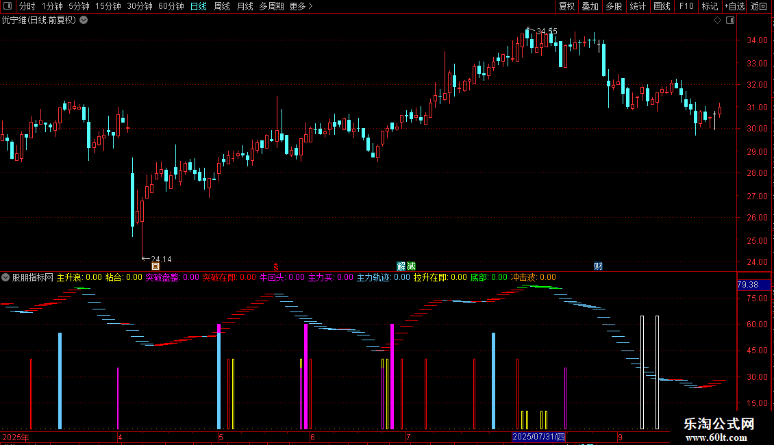 牛回头:IF(U3 OR U4,35,0),COLORFF00FF,POINTDOT;