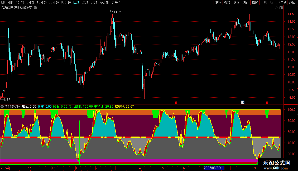 【底部侦测】副图,五层渐变色能量金字塔,独创“白-黄-绿”三级底部侦测信号