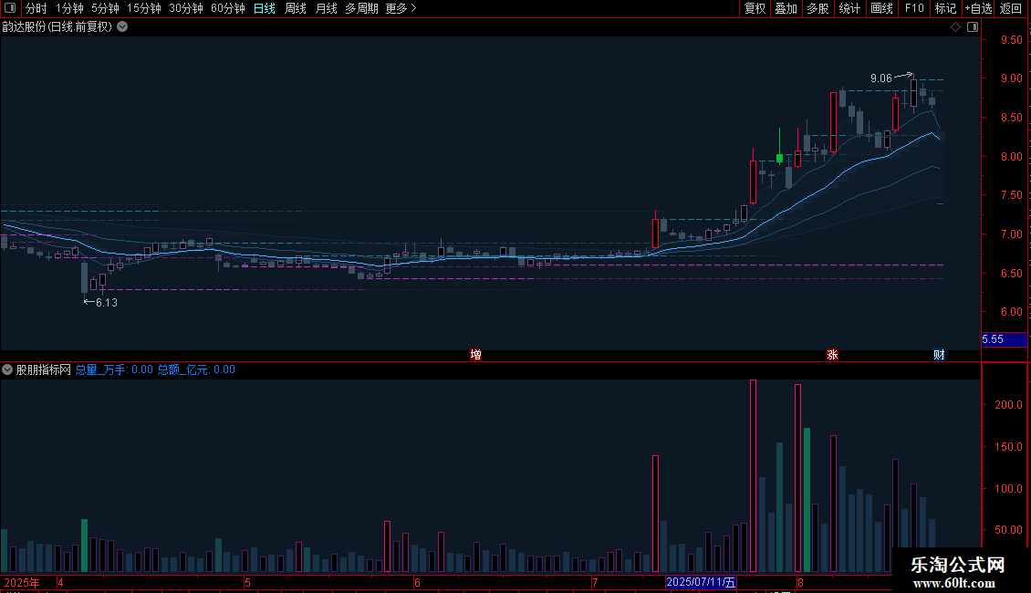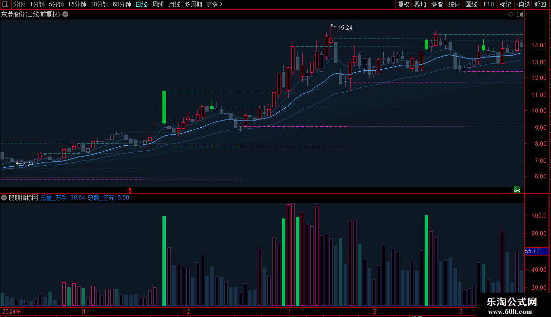 当满足条件TM=2ANDKXN=0时,在收盘价和开盘价位置之间画柱状线,宽度为2,0不为0则画空心柱.,COLOR604E3C