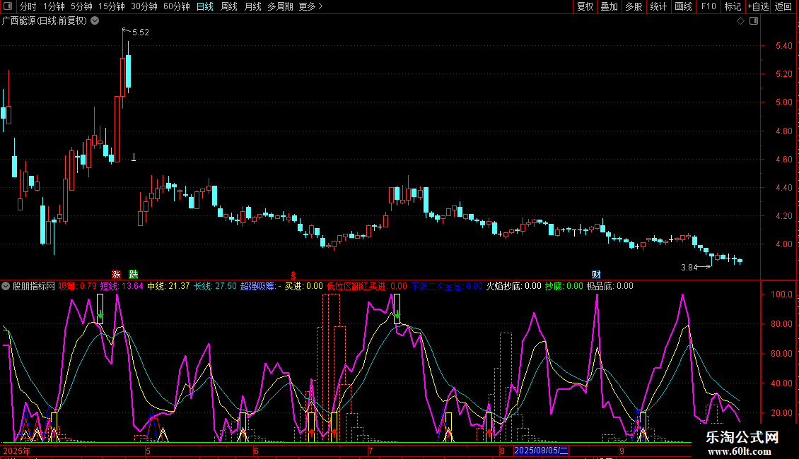 短线:(CLOSE-LLV(LOW,N))/(HHV(HIGH,N)-LLV(LOW,N))*100,COLORMAGENTA,LINETHICK2;