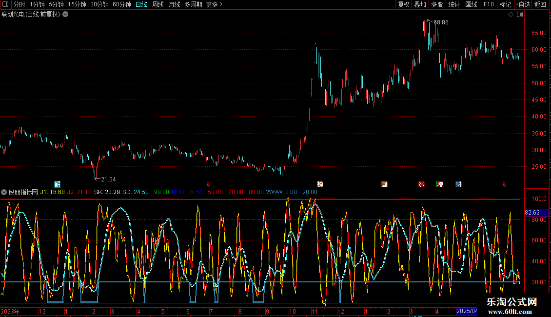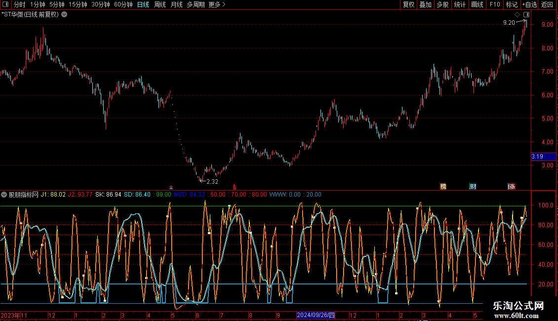 SD: EMA(0.667*REF(SK,1)+0.333*SK,1),COLORCYAN,LINETHICK1;