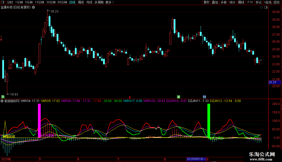 指标主要功能是计算股票价格波动强度,通过多组移动平均线交叉和相对位置变化判断买卖信号。操作策略上,当短期均线(如3日、5日)上穿长期均线(如6日、12日)时显示红色买入提示,下穿时显示绿色卖出提示;同时结合价格超跌/超涨区域(如低于30日均线70%)标记底部/顶部预警,并在关键位置(如20/80分界线)标注资金流向(红色多头/绿色空头)。整体通过颜色区分趋势强弱,辅助短线交易决策。