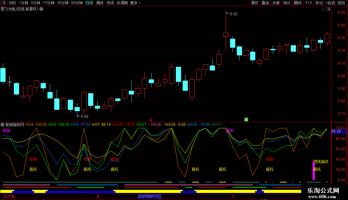指标主要用于判断股票短期买卖信号,通过计算不同周期内价格相对位置(如5日/10日/30日高低点百分比)和均线偏离度,结合平滑移动平均线(SMA)生成动态信号。当短期价格突破近期低点或均线金叉时,指标会标注短线启动或突破提示;当多周期相对位置同时超卖时,则提示抄底机会。操作上可关注底托文字信号及指标线交叉点,短线交易者可结合突破信号入场,中长线投资者可参考低位启动信号分批建仓。