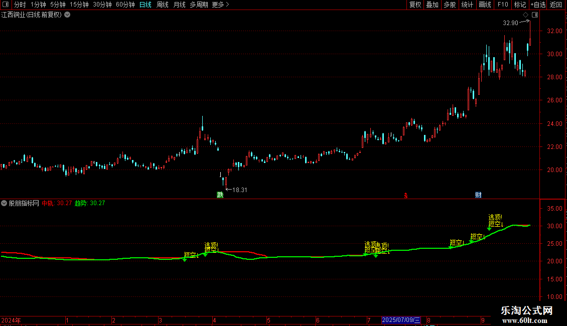 中轨:HHV(MA(H,13),13),COLORRED,LINETHICK2;
