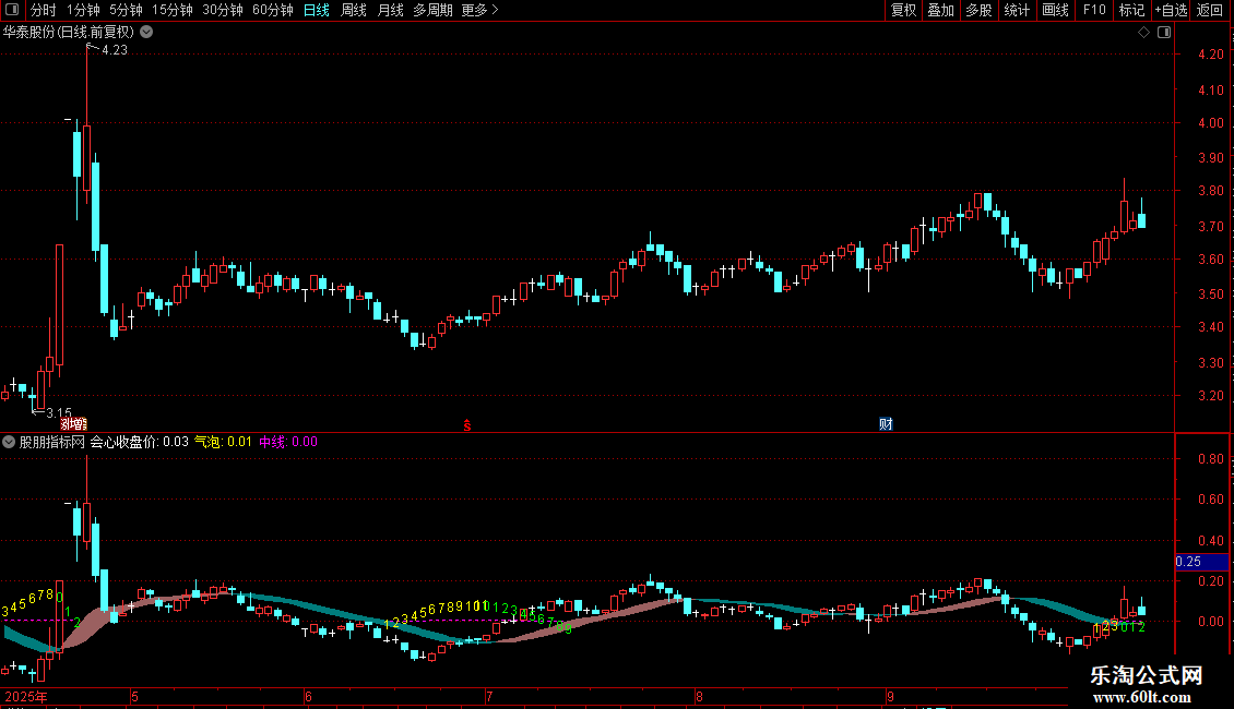 VAR1Z:=REF(MA(C,20),10);开:=O-VAR1Z,NODRAW;高:=H-VAR1Z,NODRAW;低:=L-VAR1Z,NODRAW;会心收盘价:C-VAR1Z,NODRAW;MID:=(3*会心收盘价+低+开+高)/6;红线:=(20*MID+19*REF(MID,1)+18*REF(MID,2)+17*REF(MID,3)+16*REF(MID,4)+15*REF(MID,5)+14*REF(MID,6)+13*REF(MID,7)+12*REF(MID,8)+11*REF(MID,9)+10*REF(MID,10)+9*REF(MID,11)+8*REF(MID,12)+7*REF(MID,13)+6*REF(MID,14)+5*REF(MID,15)+4*REF(MID,16)+3*REF(MID,17)+2*REF(MID,18)+REF(MID,20))/210,COLORLIRED;绿线:=MA(红线,6),COLORLIGREEN;X1:=ABS(红线)/0.9,COLORBROWN;气泡:IF(红线<=0,X1,DRAWNULL),COLORYELLOW,NODRAW;中线:IF(红线<0,(X1+红线)/2,DRAWNULL),COLORMAGENTA,DOTLINE;DRAWBAND(绿线,RGB(0,124,124),红线,RGB(155,96,96));DRAWKLINE(高,开,低,会心收盘价);ZP:=红线<=0 AND 气泡>REF(气泡,1);天数:DRAWNUMBER(ZP,气泡,BARSLAST(REF(红线,1)>0 AND 红线<0)),COLORYELLOW;ZP1:=红线<=0 AND 气泡<REF(气泡,1);天数1:DRAWNUMBER(ZP1,气泡,BARSLAST(REF(气泡>REF(气泡,1),1) AND 气泡<REF(气泡,1))),COLORGREEN;