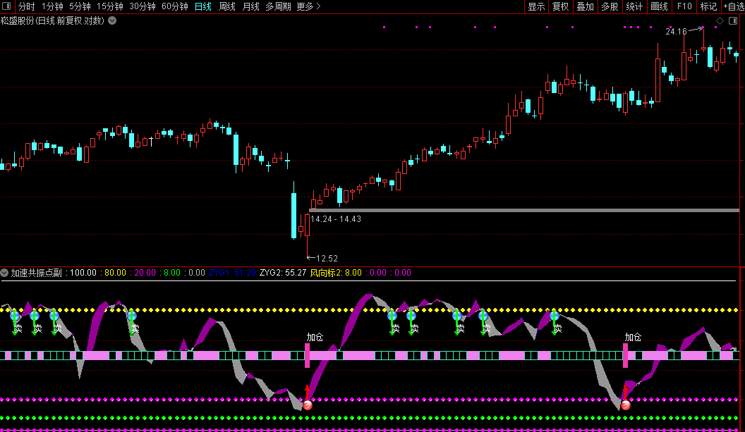 指标设有20、80和8三条关键参考线,分别对应加仓、卖出和买入信号。当指标由下向上突破8时,标记买入信号;突破20时提示加仓机会;当指标从高位下穿80时,则发出卖出警示。此外,指标还通过彩色柱状线和图标直观标示买卖点,帮助投资者快速把握股价的加速启动和转折时机。