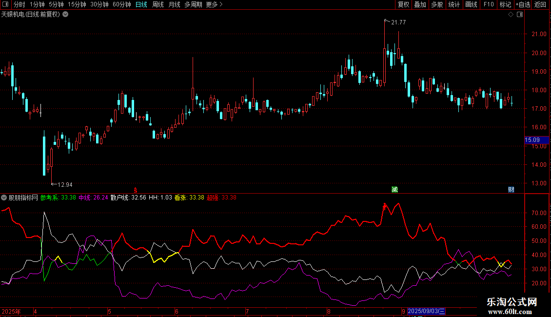 VAR1:=POW(10,6);VAR2:=IF(VAR1>0,1,0);VAR3:=SUM(MAX(MAX(HIGH-LOW,ABS(HIGH-REF(CLOSE,1))),ABS(REF(CLOSE,1)-LOW)),10);VAR4:=HIGH-REF(HIGH,1);VAR5:=REF(LOW,1)-LOW;VAR6:=SUM(IF(VAR4>0 AND VAR4>VAR5,VAR4,0),20);VAR7:=SUM(IF(VAR5>0 AND VAR5>VAR4,VAR5,0),20);VAR8:=LLV(LOW,240);VAR9:=HHV(HIGH,240);参考系:(CLOSE-VAR8)/VAR8*100,COLORGREEN;中线:VAR7/VAR3/2*100,COLORMAGENTA;散户线:(VAR9-CLOSE)/CLOSE*100,COLORWHITE;HH:参考系/散户线,NODRAW,COLORWHITE;VAR10:=HHV(CLOSE,20);VAR11:=EMA(VAR10,30)*1.03;VAR12:=EMA(VAR10,120)*1.03;VAR13:=(CLOSE+HIGH+LOW)/3;VAR14:=EMA(VAR13,10);VAR15:=REF(VAR14,1);看涨:IF(参考系>15 AND 参考系>中线,参考系,DRAWNULL),COLORYELLOW,LINETHICK2;TY:=H;超强:IF(参考系>30 AND 参考系>散户线,参考系,DRAWNULL),COLORRED,LINETHICK2;DRAWICON(FILTER(看涨 OR 超强 AND 参考系>=HHV(参考系,10) AND OPEN/VAR14< 1.08 AND OPEN/VAR11< 1.1 AND OPEN/VAR12< 1.2 AND CLOSE>VAR11 AND CLOSE>=REF(CLOSE,1)*1.05 AND 散户线< 60 AND 参考系< 120,30),参考系,1)*VAR2;